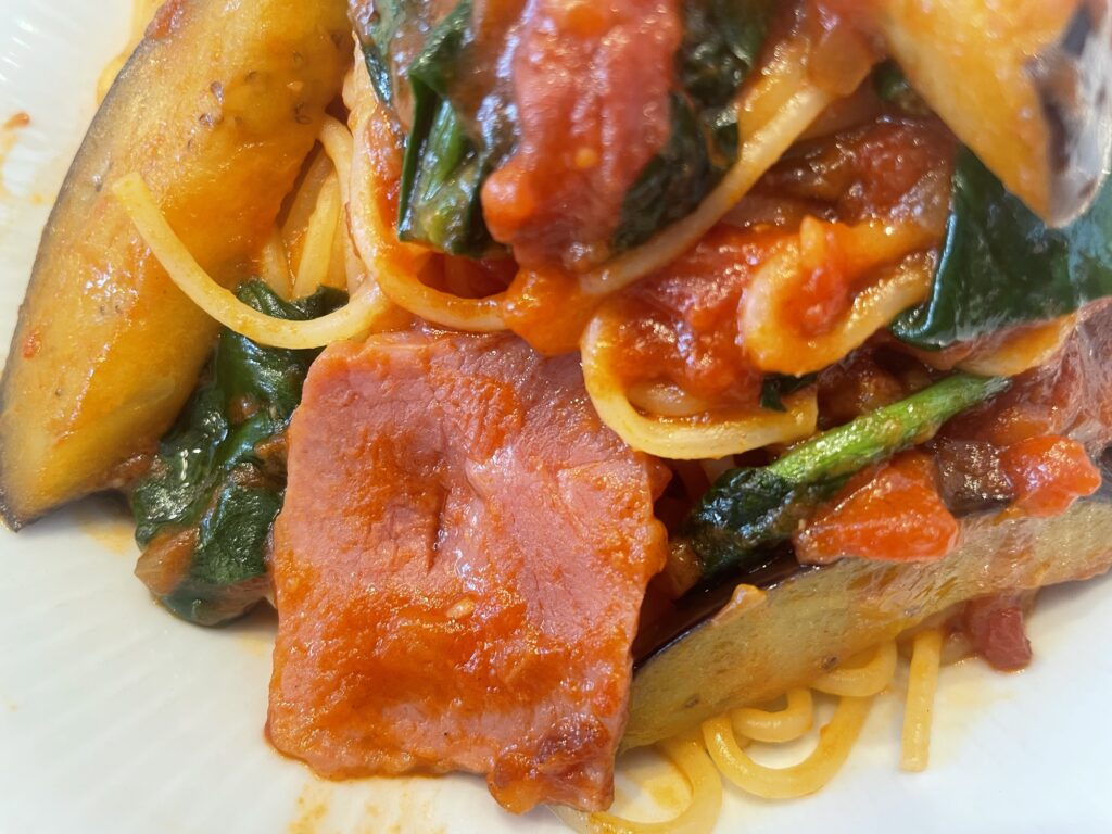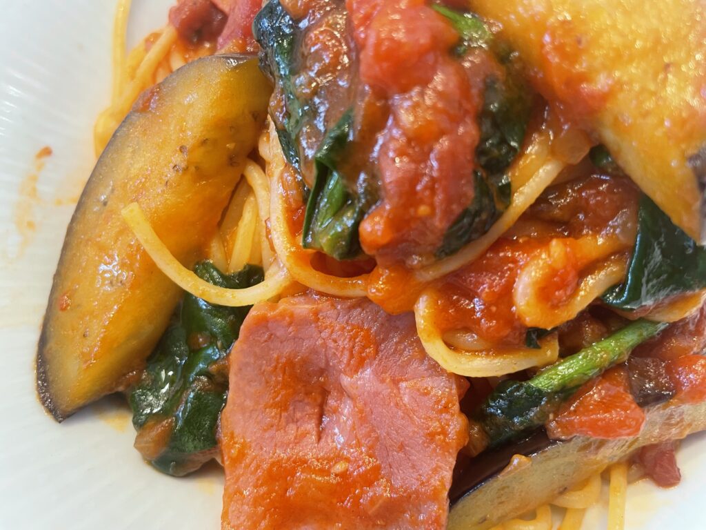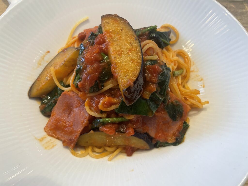 ジューシーな茄子、彩り豊かなほうれん草、そして濃厚なトマトソース。この3つの相性はまさに抜群。王道だからこそ、素材の良さと調理の丁寧さが光る一皿でした。