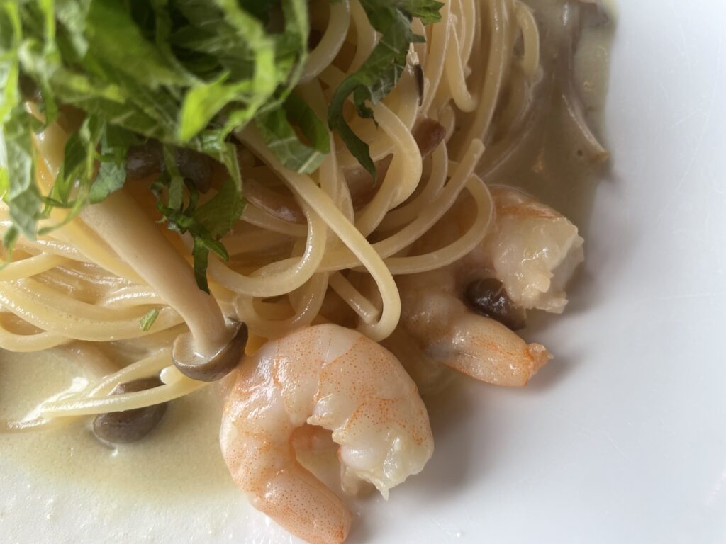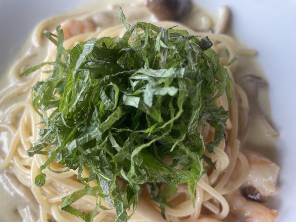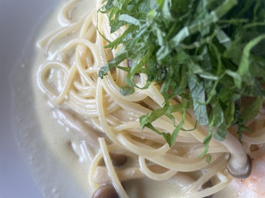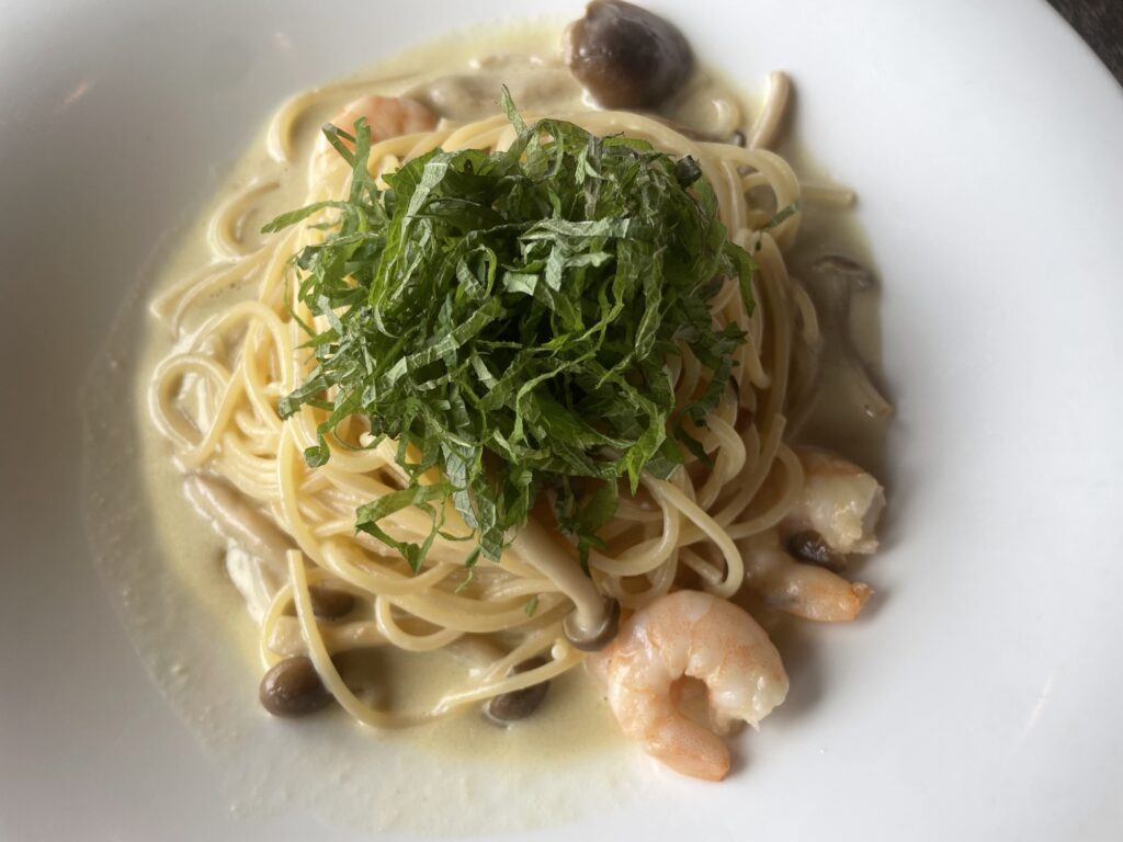 ここでしか食べられない限定メニュー!カルボナーラの濃厚さとは対照的に、青じその香りがふわりと抜ける爽やかな仕上がり。濃厚なコクがあるのに、後味はさっぱり。2人で違うタイプを頼んで大正解でした。