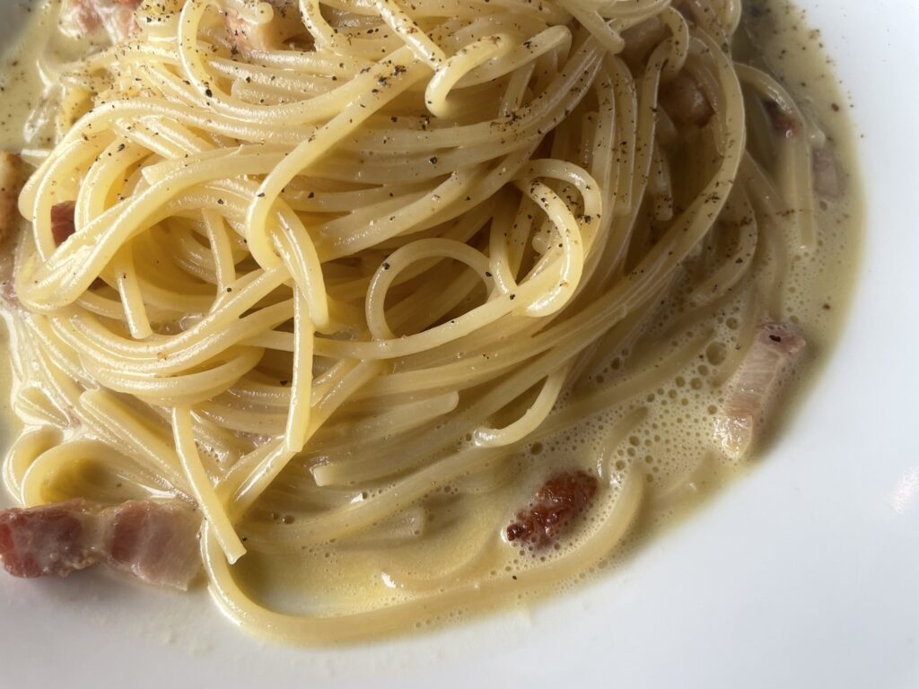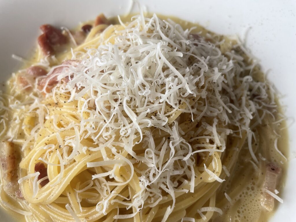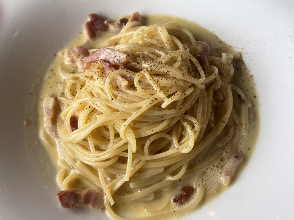 なんとこのカルボナーラ、「ストップ!」と言うまで目の前でチーズを削りかけてくれるんです!これにはテンション爆上がり。濃厚なソースに削りたてのチーズが溶け合い、一口食べればその濃厚さに溺れます(笑)。