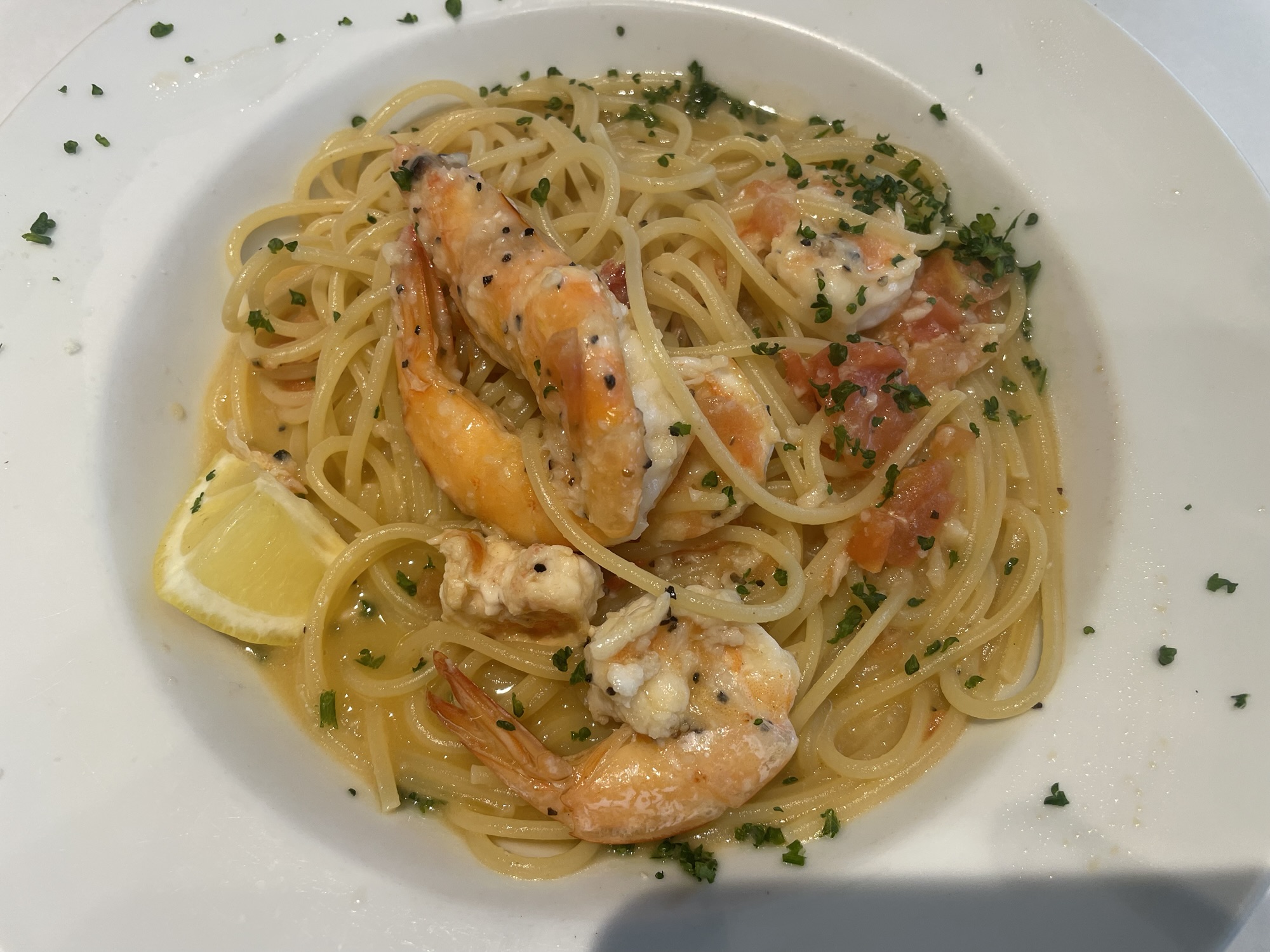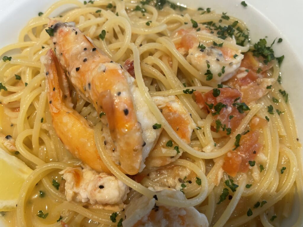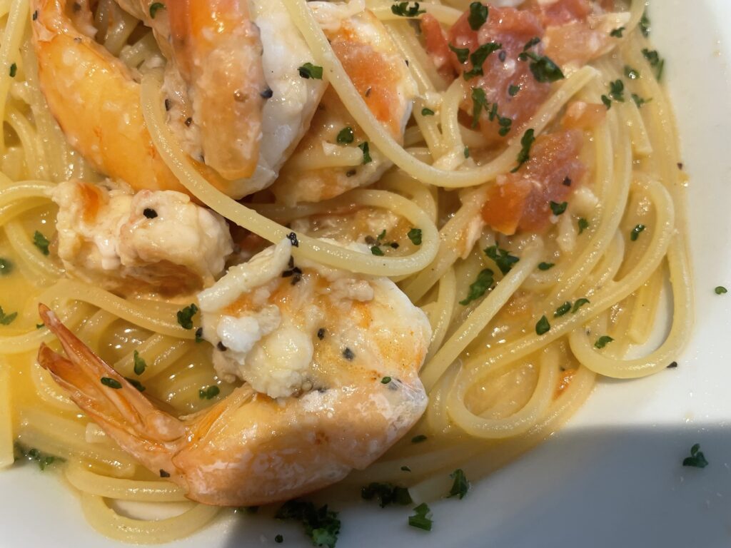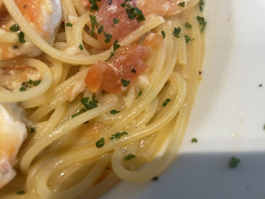 驚いたのは海老の量です。「パスタの具材」というレベルを超えて、ゴロゴロと贅沢に入っています。プリップリの食感を楽しめる大ぶりの海老がこれだけ入っていると、最後まで「海老を食べている!」という実感が続き、満足度が非常に高いです。