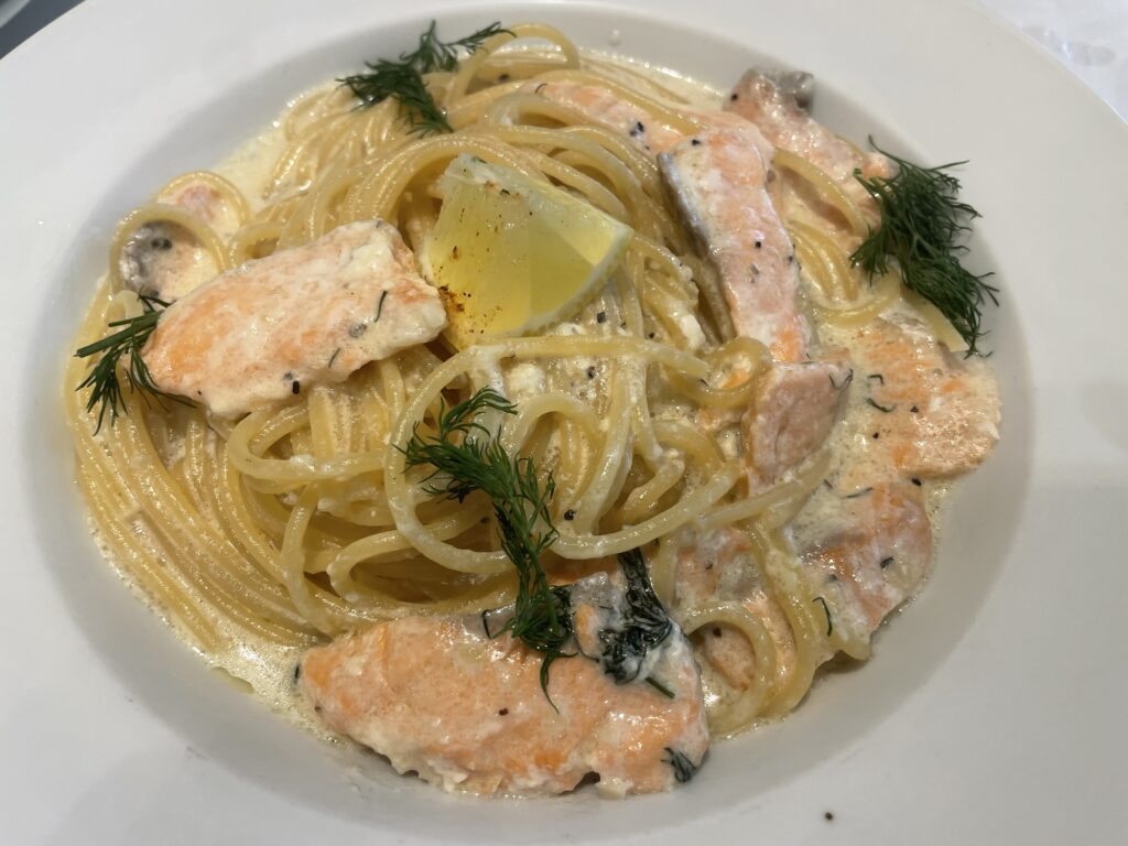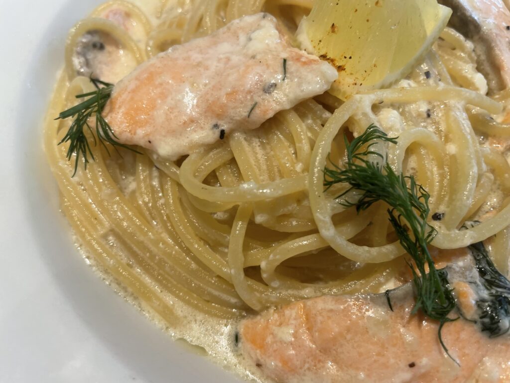 こちらも、とにかくサーモンがたっぷり!惜しみなく投入されたサーモンの身はふっくらとしていて、クリームソースとの相性も抜群です。パスタの麺一本一本にサーモンの旨味が絡みつき、シーフード専門店としてのこだわりを強く感じる仕上がりでした。