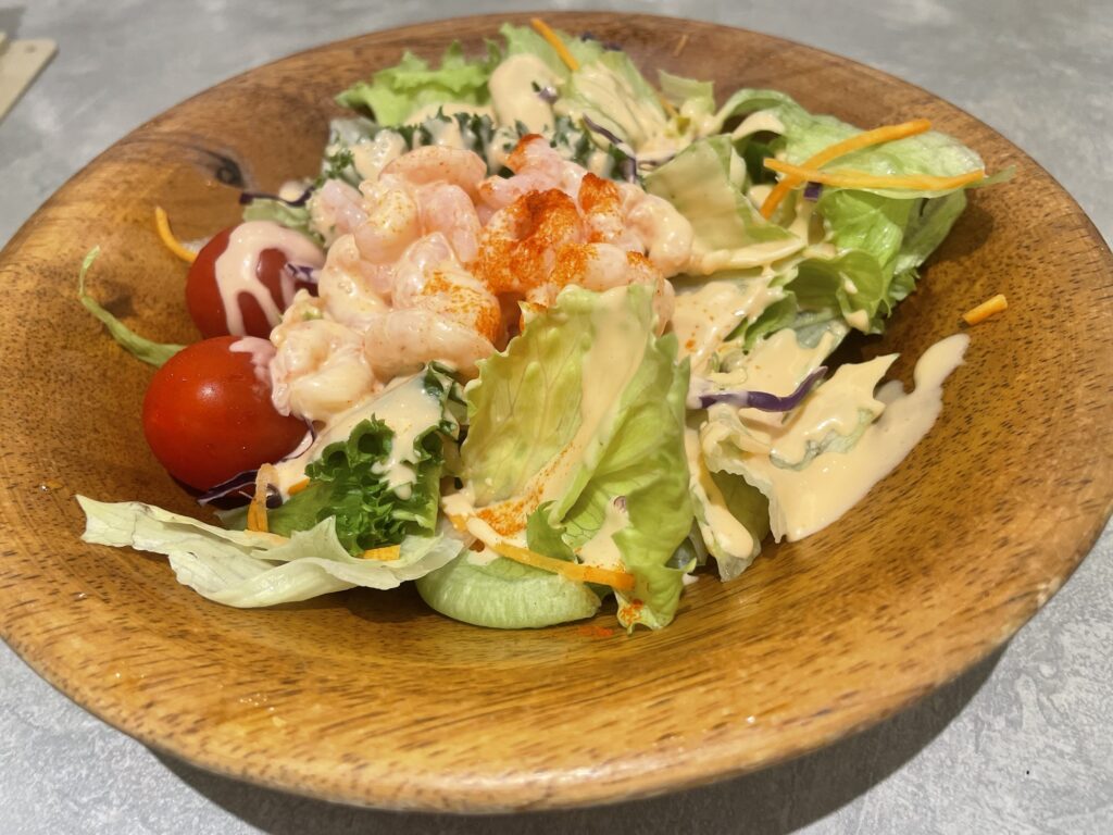 その次に現れるのが、主役である小エビのサラダ。ぷりぷりの小エビとシャキシャキのレタスが、ポップコーンシュリンプの濃厚な味わいを引き立てます。