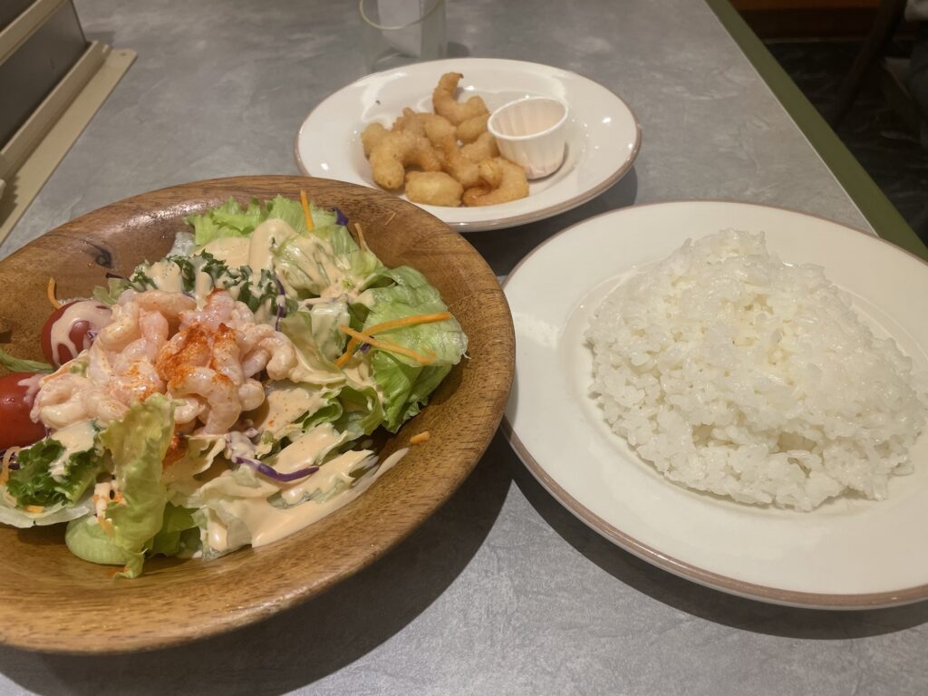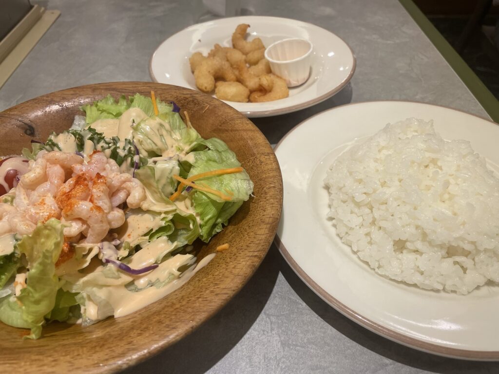 さらに驚いたのが、この「ポップコーンシュリンプサラダ」とライスの組み合わせです。ポップコーンシュリンプの香ばしい風味とドレッシングの酸味が、白米と驚くほどマッチするのです。