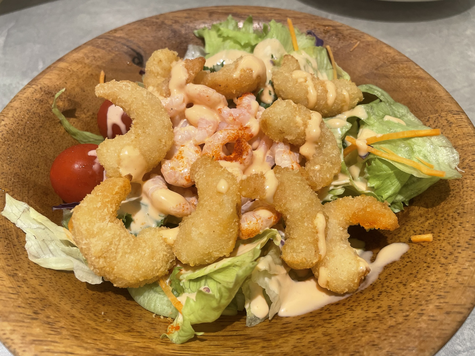 このサラダだけでも十分満足度が高いのですが、今回はさらに「ポップコーンシュリンプ」を追加しました。