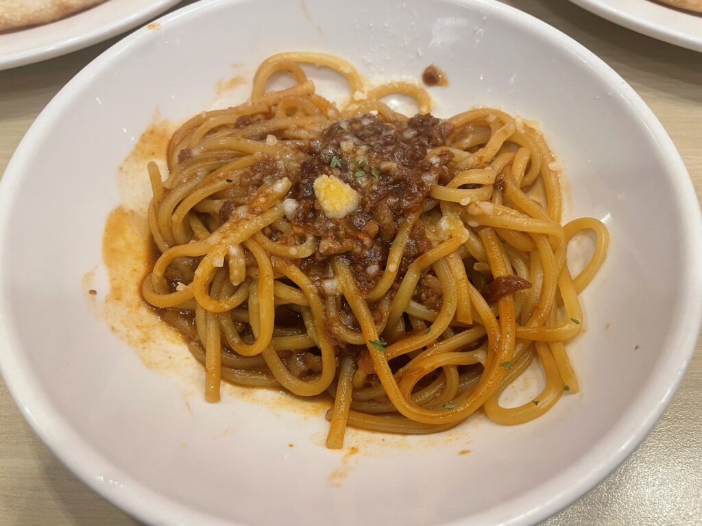 「ハーフ」と聞くと物足りないかな?と思うかもしれませんが、これがしっかりとした満足感なんです。濃厚なミートソースはコクがあって、食べ応えも十分。パスタにしっかり絡んで、口の中に旨みが広がります。