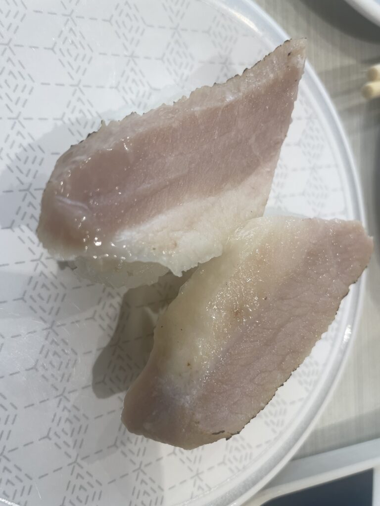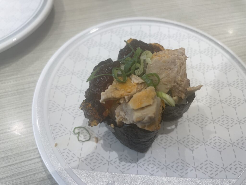 豚塩カルビは、すだちおろしがさっぱりと効いていて、脂の旨味と相まって絶妙なバランス。まるで焼肉屋さんの豚トロをそのままお寿司にしたような感じで、ご飯との相性も抜群でした。
