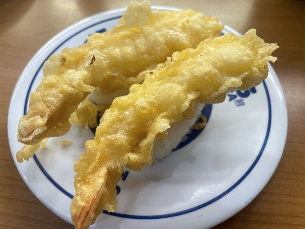 最後に注文したえび天にぎりは、サクサクの衣とプリプリのえびが、シャリと絶妙にマッチ。揚げたての温かさと、お寿司のヒンヤリ感が同時に楽しめる、食感も楽しい一皿でした。