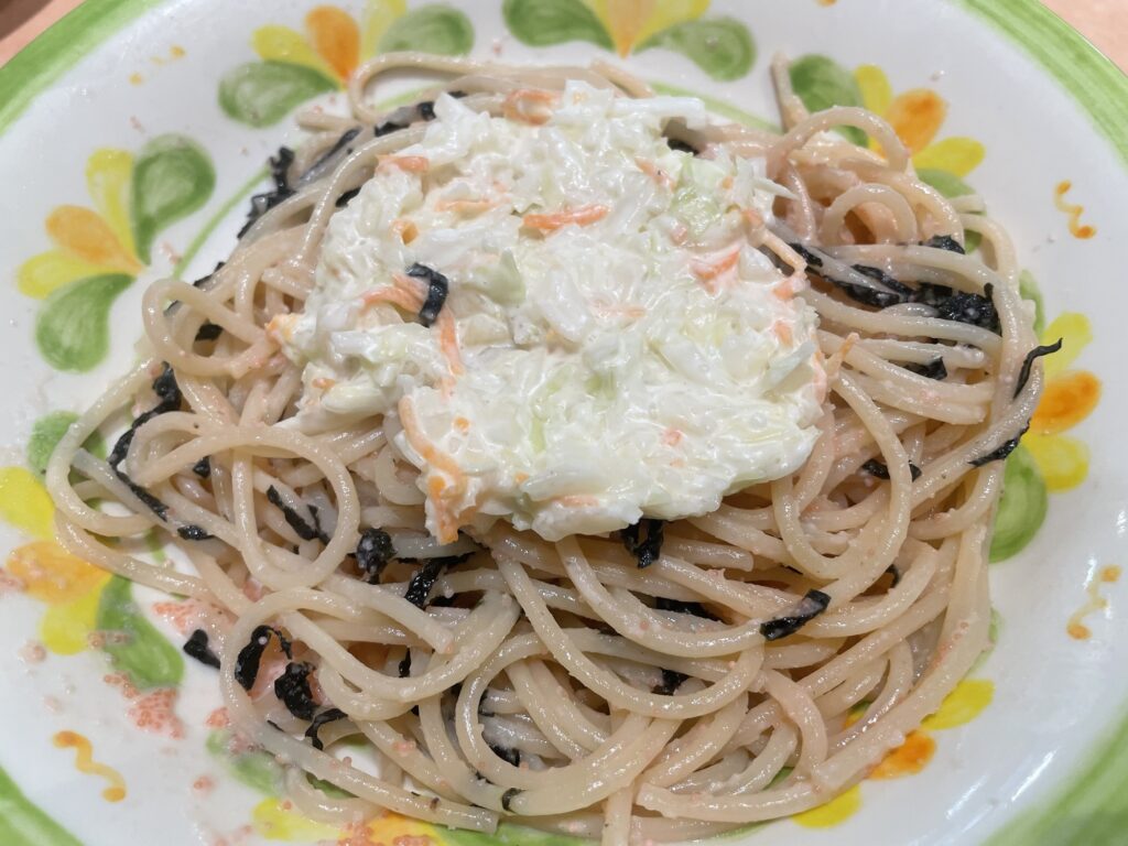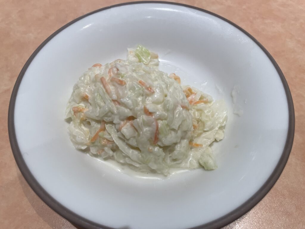 そのまま食べても大満足のパスタですが、途中で付いてきたコールスローサラダを全量投入する「サラダパスタ化」を決行しました。コールスローはキャベツのシャキシャキ感と、マヨネーズベースのさっぱりしたドレッシングが特徴です。