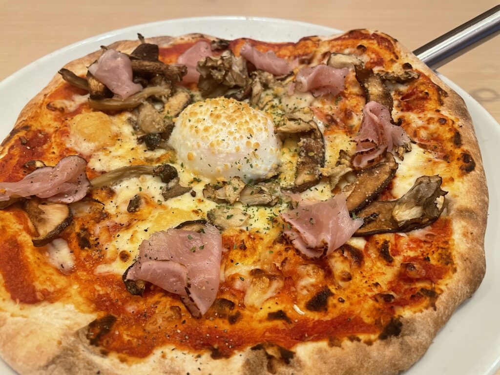 さらにトッピングの主役の一つである「炙り生ハム」が絶妙!ほどよい塩気と炙られた香ばしさが、きのこの優しい風味とチーズのコクと見事に調和しています。