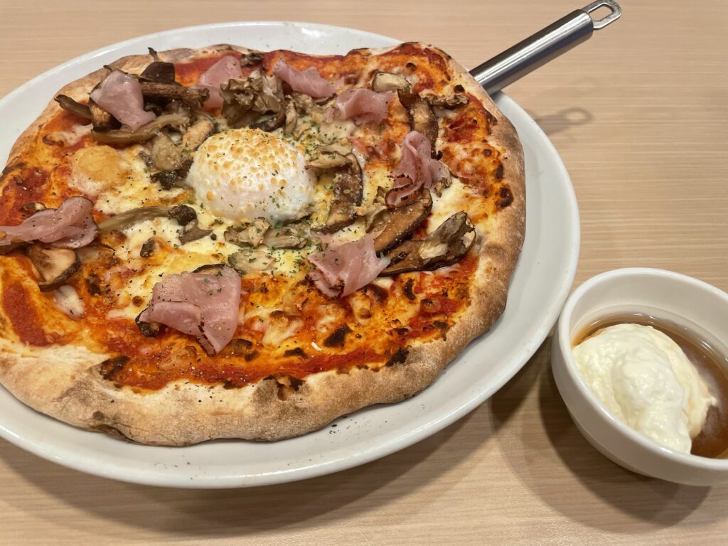 「3種きのこと炙り生ハムのピザ」は単体でも十分美味しいのですが、+50円の追加オプションで一枚のピザで二度美味しい体験ができる魔法のようなメニューになります。