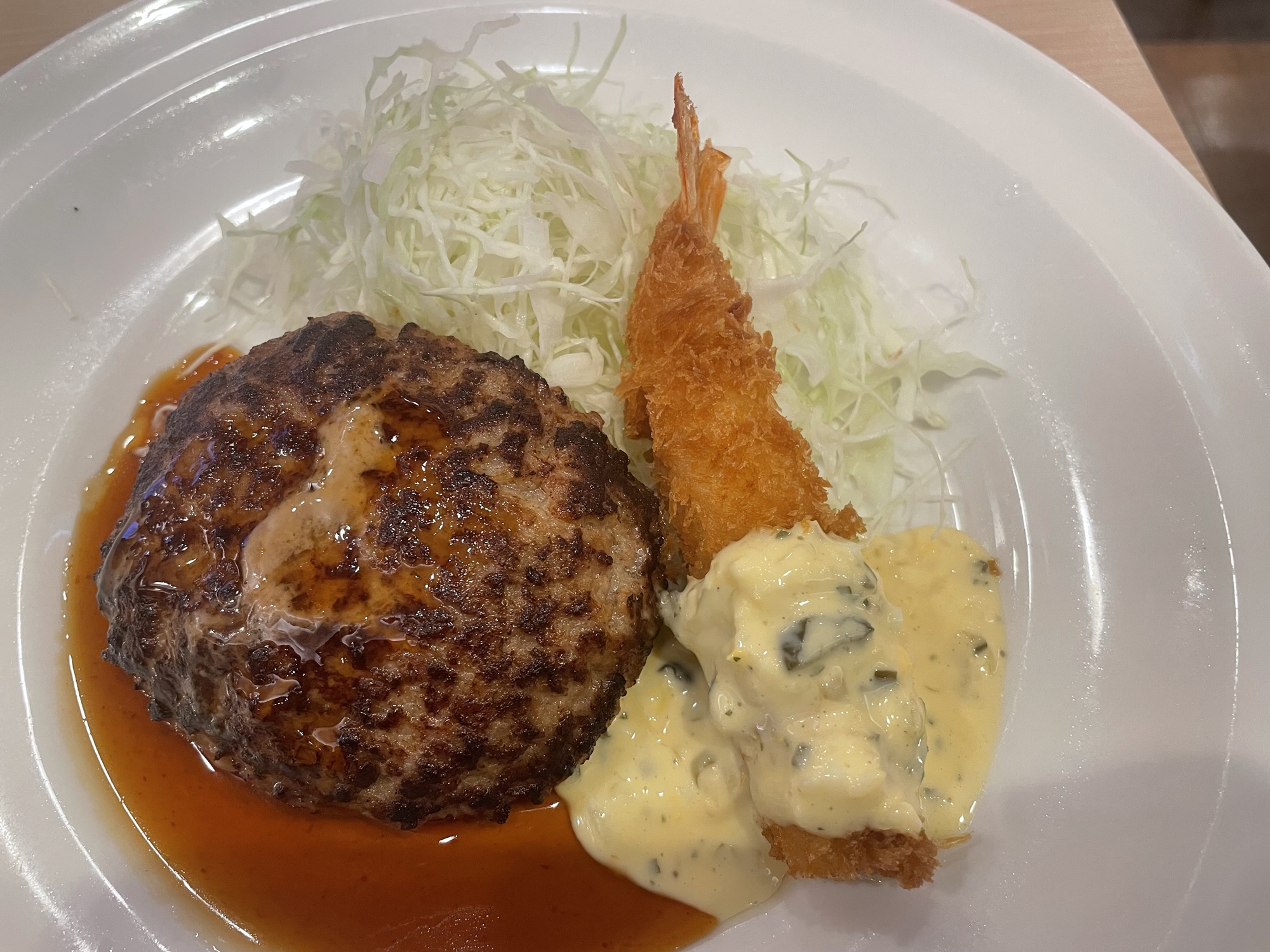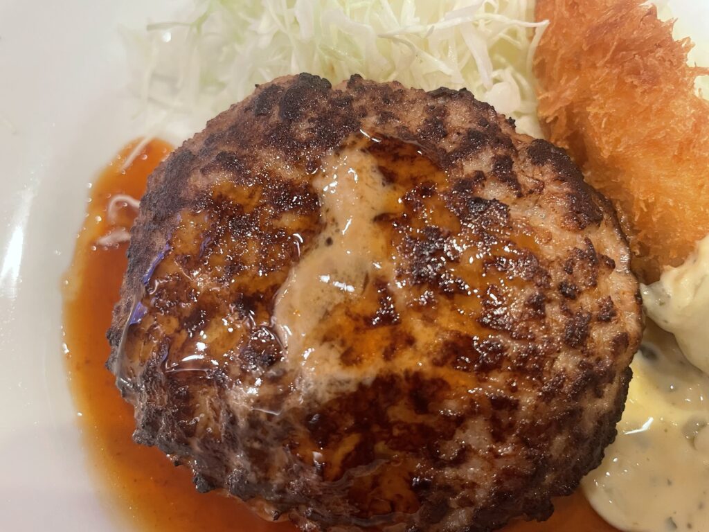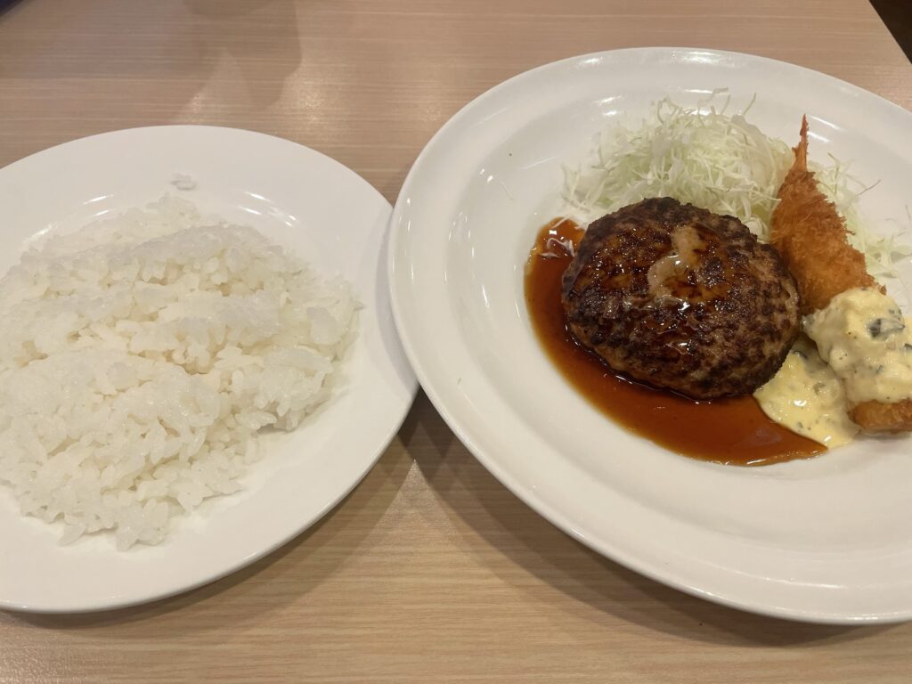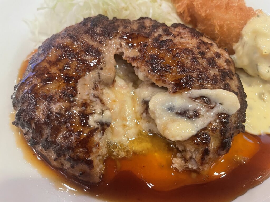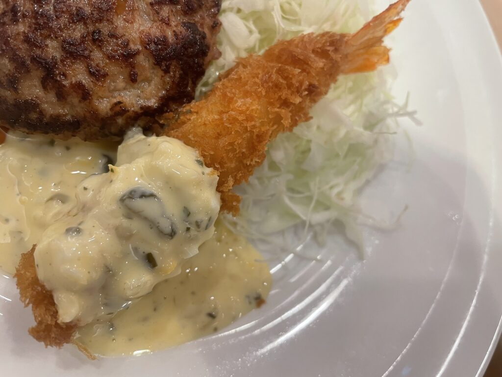 特筆すべきはハンバーグと海老フライを一緒に食べても格別の美味しさだったこと!てり焼きソースとタルタルソース、チーズの旨みが混ざり合い、口の中で小さなごちそうが完成します。