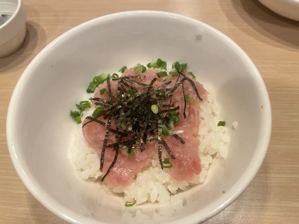 ご飯は酢飯ではないものの、ねぎとろのまったりとしたコクと刻み海苔、小葱の香りがシンプルながらも美味しい組み合わせです。マグロのたたきは良質なたんぱく質も豊富で、カロリーを気にせず満足感が得られます。