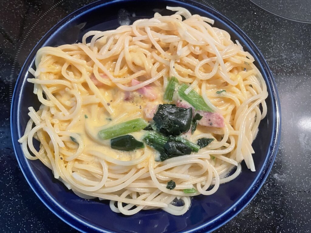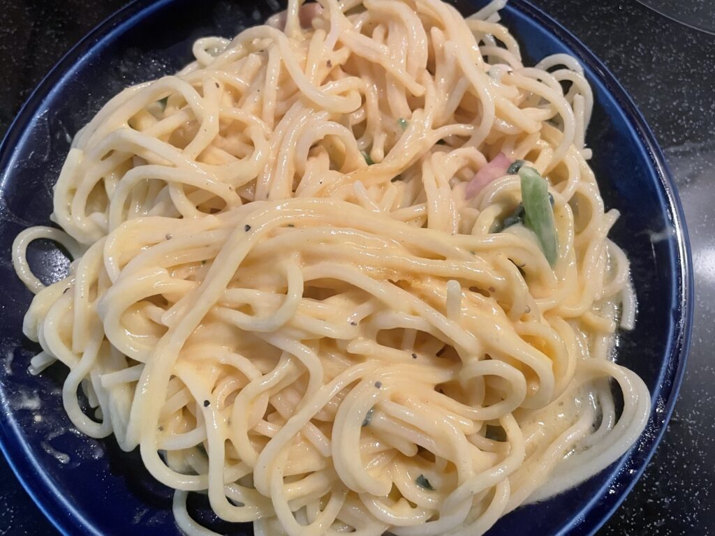具材はベーコンとほうれん草が入っており、彩りも豊か。濃厚なソースの中で、ブラックペッパーのピリッとしたアクセントが効いており、最後まで飽きさせない工夫が感じられます。