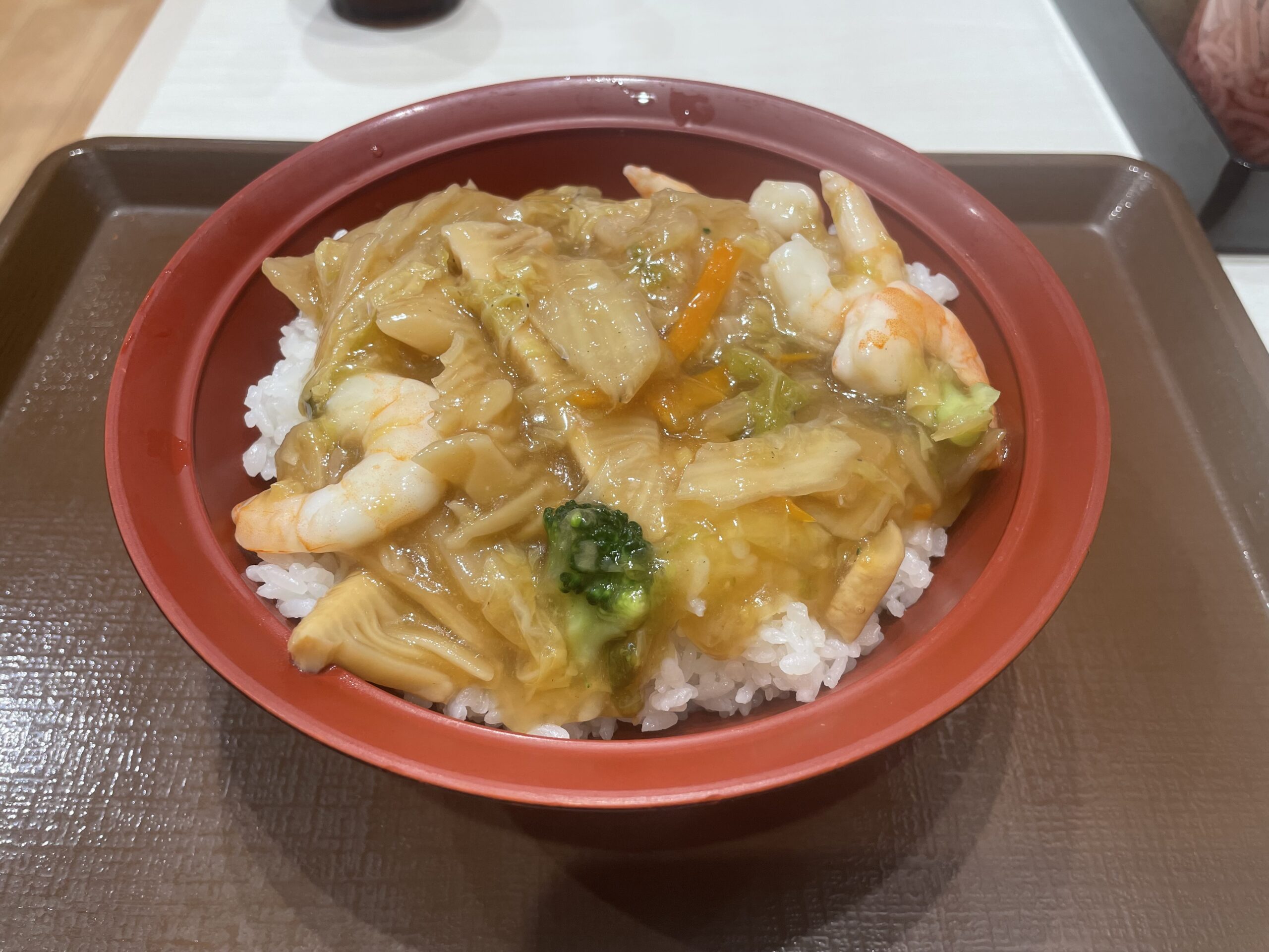 「海老中華丼」単体でも十分美味しいですが、牛丼チェーンならではの「牛あいがけ」という選択肢があるのも嬉しいポイント。途中で味変をしたり、ガッツリ感をプラスしたりと、楽しみ方が広がります。