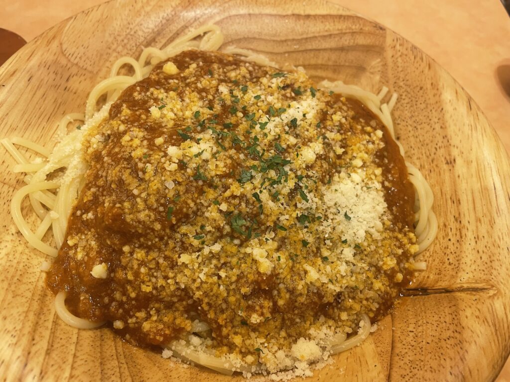 熱々の状態で運ばれてくるミートソースは、ひき肉と野菜の旨みがしっかりと溶け込んでいます。