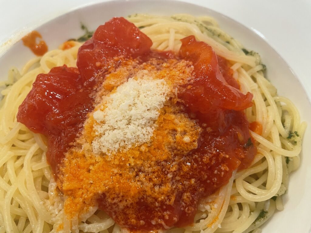 トマトの程よい酸味と甘み、そしてバジルの香りが絶妙なバランス。こちらもチーズが良いアクセントになっていて、ソースのコクを引き立てています。