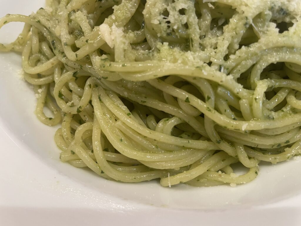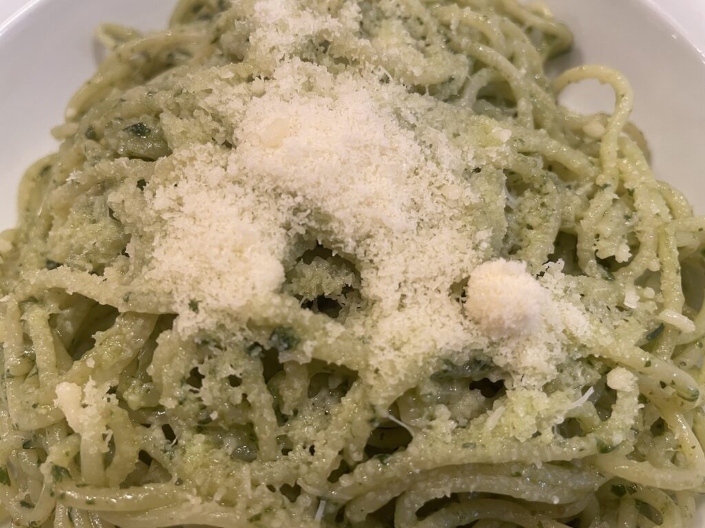 鮮やかなグリーンのソースが、モチモチの麺によく絡んで美しい……!
