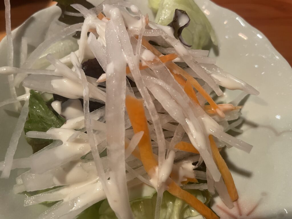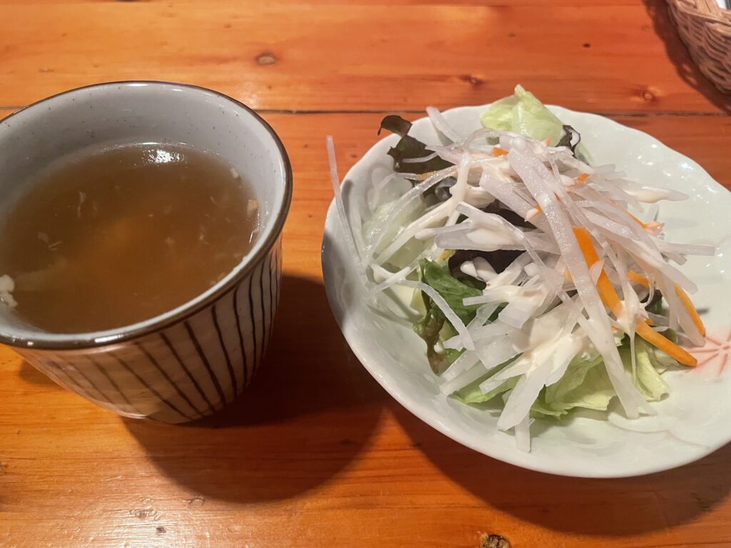 まず運ばれてきたのは、サラダとスープ。サラダには爽やかなフレンチドレッシングがたっぷりかかっており、新鮮な野菜の美味しさを引き立てていました。シンプルながらも丁寧な一品です。