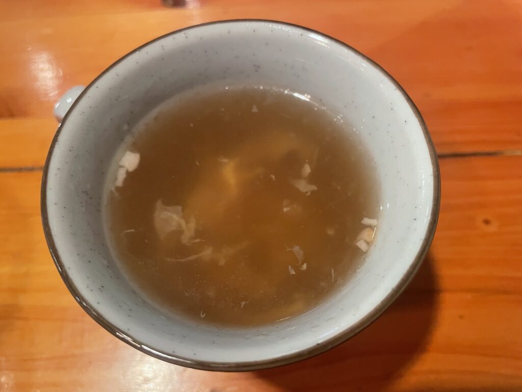 そして、コンソメスープも絶品!玉ねぎや卵などの具材が入っており、コンソメの旨味が溶け込んでいて、優しい味わいにホッとします。
