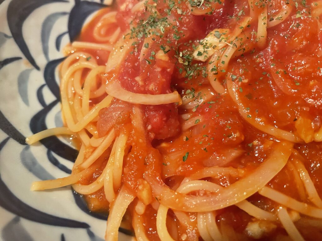 トマトとニンニクの旨味が凝縮されたソースが、細麺によく絡みつき、口いっぱいに美味しさが広がります。